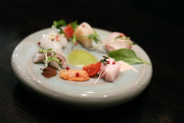 สำหรับเชฟวะตะรุบินมาโปรโมทงานสุดยอดศาสตร์ศิลป์ญี่ปุ่นเมื่อหลายเดือนก่อน พร้อมโชว์การปรุงเมนูเด็ดเซิร์ฟๆ เรียกน้ำย่อยไว้ 3 เมนูพิเศษก่อนที่จะได้ลิ้มรสครบคอร์สทั้งหมด 6 เมนูในวันงานจริง เริ่มต้นที่เมนูแรก “โอซึกุริ” (Otsukuri) ซาชิมิรวมหลากหลายชนิดที่นำมาจากทะเลญี่ปุ่นโดยตรง ประกอบไปด้วย ปลากะพงแดง ปลาหางเหลือง ปลาหมึกกล้วย