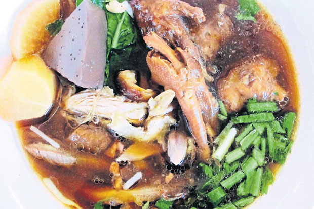 น้ำซุปก๋วยเตี๋ยวซดคำแรกนัวหลาย แหะๆๆ แปลให้ก็ได้ น้ำซุปร้านนี้กลมกล่อมมากๆ ซดคำแรกแล้วอยากซดต่อ ซดได้เรื่อยๆ รสไม่จัด ไม่เค็ม ไม่หวาน กลางๆแต่มีความนัวอยู่ในน้ำซุป สีน้ำตาลเข้มจนเกือบดำ หอมเครื่องที่เขาผสมต้มในหม้อ เปิดฝาหม้อออกมา ยั่วน้ำลายชะมัด