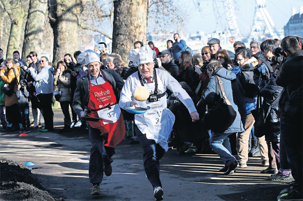 การแข่งขันวิ่งถือกระทะแพนเค้กบริเวณใกล้กับรัฐสภาแห่งสหราชอาณาจักร ได้สร้างความฮือฮาไปทั่วเกาะแห่งนี้ และทั่วโลกก็พากันขำ