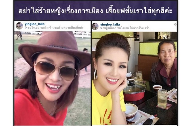 "อย่าใส่ร้ายเรืองการเมือง เสื้อแฟชั่นเราใส่ทุกสี ร่างกายหญิงเหนื่อยเพราะทำงานอยู่แล้ว แต่ยิ่งเหนื่อยใจเพิ่มขึ้นกับคนที่เอาภาพหญิงไปพิมพ์ใส่ร้ายหญิง หาว่าหญิง ไปต่อว่าเรื่องการเมืองบนเวทีร้องเพลง คนที่หลงเชื่อ ก็ด่าว่าหญิงสารพัด เครียดค่ะ ขอร้องให้ท่านผู้นำชุมชนช่วยตักเตือนคนที่วิพากษ์วิจารณ์ไปมั่วๆที่ใส่ร้ายหนูหน่อยค่ะ เขาเอารูปหญิงไปพิมพ์เป็นข้อความว่าด่า
