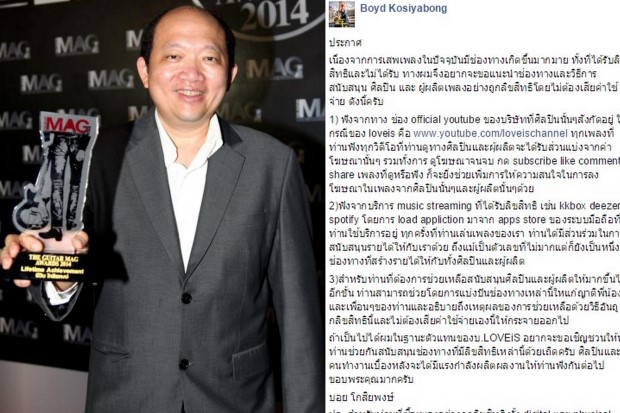 บอย โกสิยพงษ์ ประกาศผ่านเฟซบุ๊ก เชิญชวนคนไทยหันมาสนับสนุน ศิลปิน และ ผู้ผลิตเพลงอย่างถูกลิขสิทธิแบบฟรี