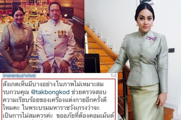 ล่าสุดส่อแววดราม่าอีกครั้งเมื่อสาวตั๊กลงภาพตนและสามีในอินสตาแกรม กลับมีคอมเม้นต์ติงเรื่องชุดของเธอที่ไม่เหมาะสมเมื่อเห็นสิ่งแปลกปลอมบางอย่างระบุว่า... "สังเกตเห็นมีบางอย่างในภาพไม่เหมาะสม รบกวนคุณ @takbongkod ช่วยตรวจสอบความเรียบร้อยของเครื่องแต่งกายอีกครั้งดีไหมคะ ในพระบรมมหาราชวังเกรงว่าจะเป็นการไม่สมควรค่ะ ขออภัยที่ต้องคอมเม้นท์บอกนะคะ"
