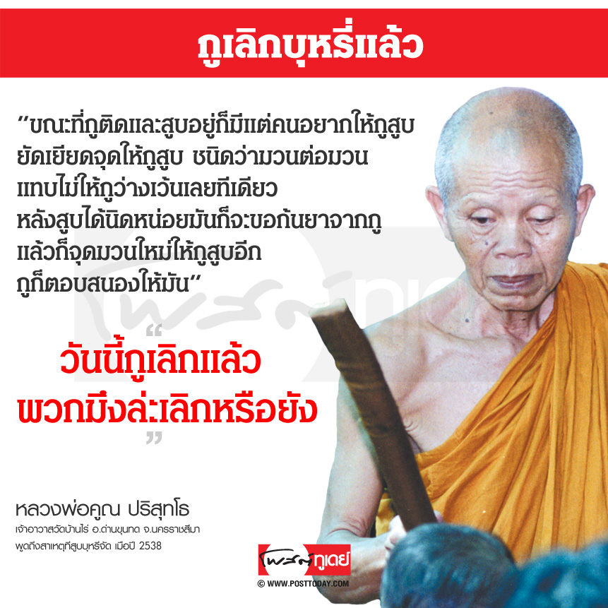 รายงานพิเศษ : เบื้องหลังโปสเตอร์ในตำนาน "กูเลิกบุหรี่แล้ว" หลวงพ่อคูณ ปริสุทโธ http://www.posttoday.com/วิเคราะห์/รายงานพิเศษ/366957/เบื้องหลังโปสเตอร์ในตำนาน-กูเลิกบุหรี่แล้ว-หลวงพ่อคูณ-ปริสุทโธ