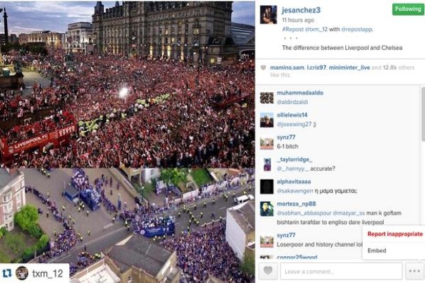 ทั้งนี้ถือเป็นธรรมเนียมที่เหล่านักเตะและทีมสตาฟฟ์ของทัพ "สิงโตน้ำเงินคราม" ต้องขึ้นรถบัสสโมสรเปิดขบวนแห่ฉลองแชมป์พรีเมียร์ลีกและแคปิตอล วัน คัพในกรุงลอนดอน แต่แฟนๆราว 70,000 คนที่ออกมาฉลองกลับดูบางตา กระทั่งฟูลแบ็คชาวกระทิงดุโพสต์รูปเปรียบเทียบกับพาเหรดของลิเวอร์พูลสมัยได้แชมป์