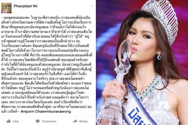 ล่าสุดชาวเน็ตมือดีจึงขุดคุ้ยประวัติภาพเก่าแบบตอนเด็กจับผิดเรื่องศัลยกรรม งานนี้พี่้สาวแท้ๆ นิต้า อนิพรรณ ได้โพสต์ข้อความลงเฟซบุ๊ก Phanpilast Nii ก่อนการประกวดจะจบลง ระบุข้อความว่า...
