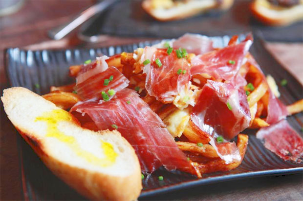 วันนี้เรามาเริ่มต้นด้วยพระเอกของร้านอย่าง โบรกเคน เอ้กส์ มันฝรั่งทอดที่เพิ่มความพิเศษด้วยการยีไข่ดาวลงไป และเพิ่มความอร่อยเพิ่มขึ้นอีกระดับด้วยการท็อปปิ้งด้วยแฮมฆามง อิเบริโค หรือจะเลือกเป็นโชริโซตามความชอบ