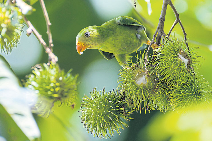 ผมใช้วิธียืนนิ่งเงียบ ค่อยๆ มองไล่ไปตามพวงเงาะและกิ่งใบที่ไหวเยิบยาบตามกระแสลม พักเดียวก็เริ่มแยกนกสีเขียวตัวน้อย ออกจากความกลมกลืนของใบและผลเงาะสำเร็จ ตอนเที่ยงมันก็ยังอยู่ และอยู่ใกล้กว่าที่คิด!