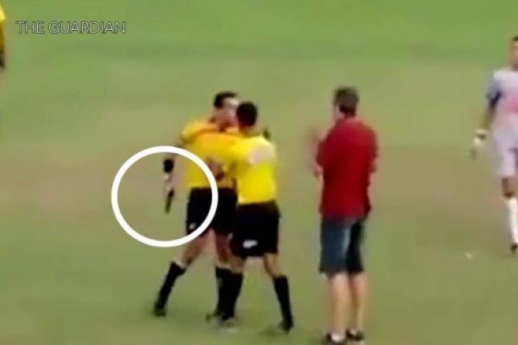 กรรมการชักปืนขึ้นขู่ยิงกลางสนาม ยั๊วถูกนักบอลตบหน้า! (ชมคลิป)
