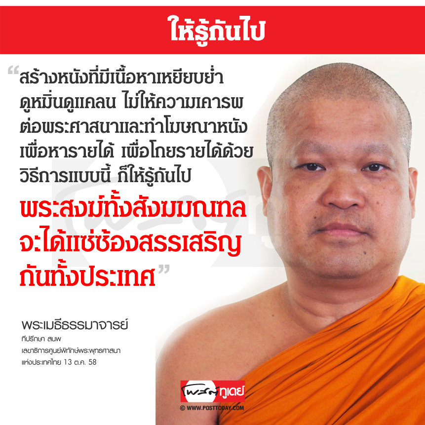 สร้างหนังที่มีเนื้อหาเหยียบย่ำ ดูหมิ่นดูแคลน ไม่ให้ความเคารพต่อพระศาสนาและทำโฆษณาหนังเพื่อหารายได้ เพื่อโกยรายได้ด้วยวิธีการแบบนี้ ก็ให้รู้กันไป พระสงฆ์ทั้งสังฆมณฑลจะได้แซ่ซ้องสรรเสริญกันทั้งประเทศ
