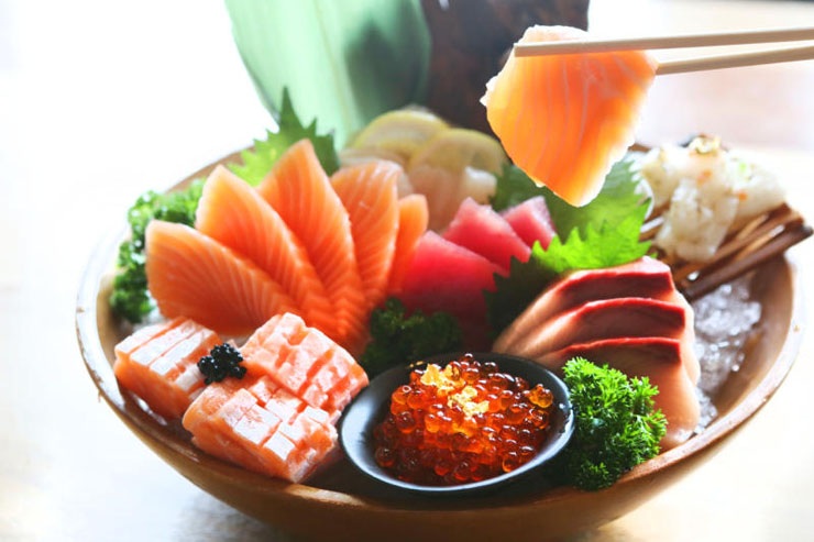 เมนูเด่นๆ จะเป็นซูชิ และซาชิมิ ที่นำเข้าวัตถุดิบจากต่างประเทศ จะเลือกแบบซูชิดั้งเดิม หรือแบบฟิวชั่นอาหารยุคใหม่ก็ได้ แนะนำวิธีการกินให้ถูกหลักและอร่อยของคนญี่ปุ่น เริ่มจากของสด ซาชิมิที่มีรสชาติอ่อนโยนสัมผัสความอร่อยได้อย่างแท้จริง กับ 7 Oceans Sashimi (1,290 บาท) รวมปลาดิบทั้งแซลมอน, แซลมอนส่วนท้อง, ฮามาจิ, อากามิ, ไข่ปลาแซลมอน และเอนกาวะ สไลซ์ชิ้นหนาวางมาบนน้ำแข็ง คงความสด หวาน คุณภาพดี ละลายในปาก จิ้มกับโชยุและวาซาบิที่ร้านทำขึ้นเองอร่อยลงตัว