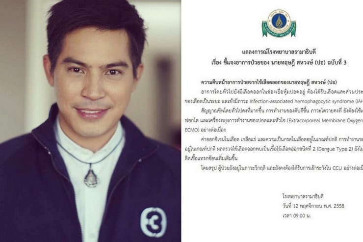 แพทย์แถลงอาการป่วย ปอ ทฤษฎี ยังอยู่ในขั้นวิกฤตใช้เครื่องช่วยหายใจ ต้องเฝ้าระวังอย่างต่อเนื่อง