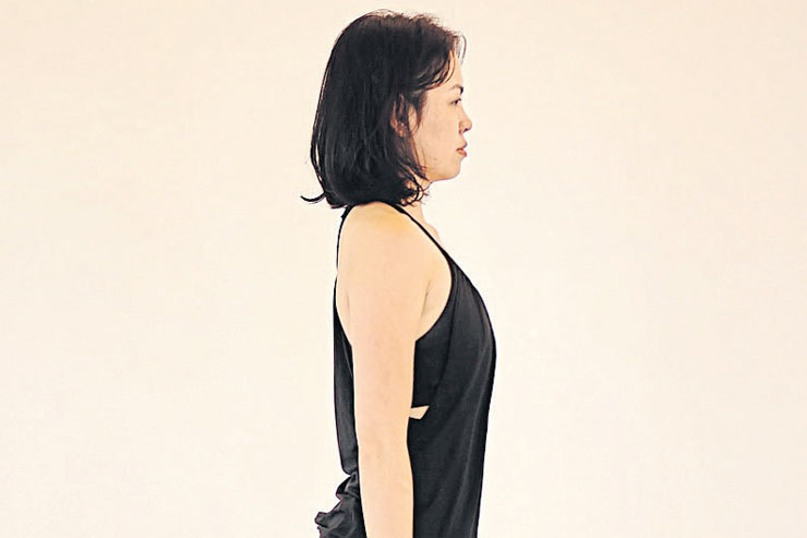 2 หายใจเข้ายกขาซ้ายขึ้นงอเข่า พร้อมกับเหยียดแขนทั้งสองขึ้นแนบใบหู