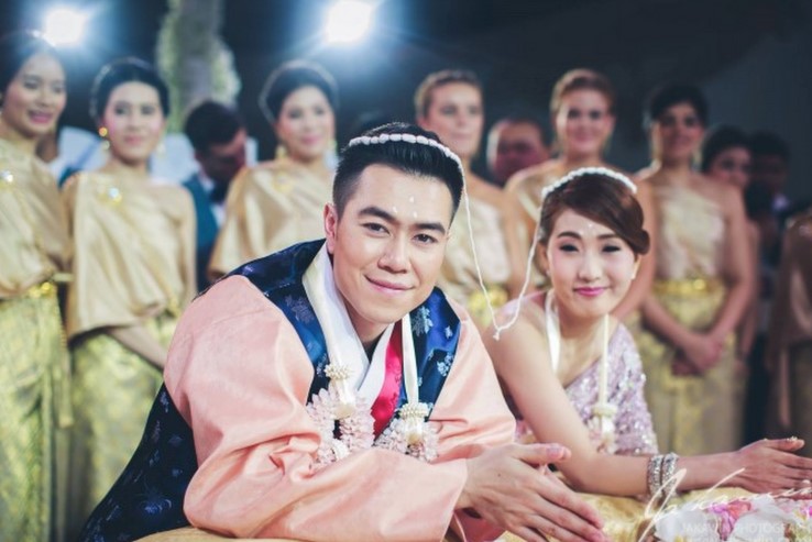 บรรยากาศเป็นไปอย่างชื่นมื่น เชื่อมวัฒนธรรมทั้งไทย-เกาหลีเอาไว้ด้วยกันอย่างลงตัว ทั้งคู่แลกกันแต่งชุดประจำชาติโดยเจ้าบ่าวแต่งกายด้วยชุดฮันบก ซึ่งเป็นชุดประชาติเกาหลี และเจ้าสาวห่มสไบชุดไทยประยุกต์อย่างสวยงาม