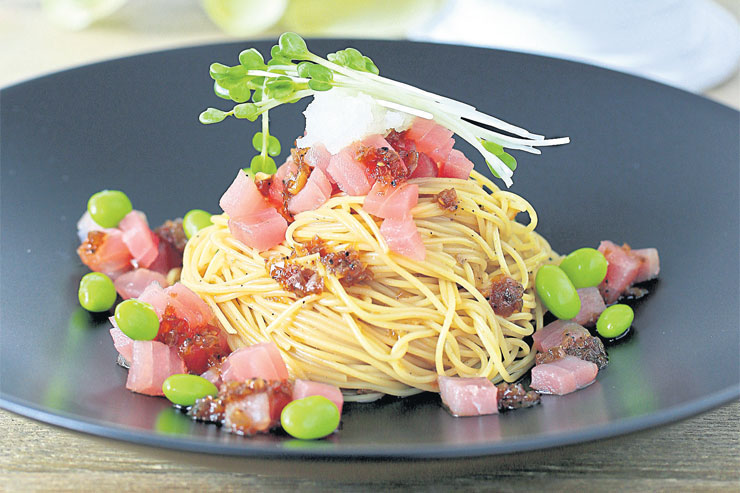 ฉบับนี้เป็นสูตรของผู้เขียนที่ทดลองทำอาหารที่มีกลิ่นอายระหว่างความเป็นโลกตะวันออกของญี่ปุ่นและความเป็นโลกตะวันตกด้วยเครื่องปรุงอย่างเส้นพาสต้า น้ำมันมะกอกและพริกไทยดำ ผสมกับความเป็นญี่ปุ่นอย่างปลาทูน่าสด ที่ต้องเป็นซาชิมิเกรด เพราะอย่างแรก คือเป็นทูน่าชนิดที่เรียกว่า Blue Fin Tuna หรือถ้าใครมี Spanish Mackerel ยิ่งเจ๋ง แต่บ้านเราตามซูเปอร์มาร์เก็ตจะหาแบบแรกได้ง่ายกว่ามากๆ ซื้อมาแช่เย็นไว้ หั่นใช้ได้ง่ายสำหรับสูตรนี้