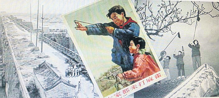 ปี ค.ศ. 1958 เพื่อเพิ่มผลผลิตให้ท้องไร่ท้องนาแบบก้าวกระโดดตามนโยบายของรัฐบาลจีน นกกระจอกถือเป็นสัตว์ที่ทำลายผลผลิต นักวิชาการจีนออกมาสนับสนุนว่าจะต้องขจัดนกกระจอกที่คอยมากินเมล็ดข้าวให้หมดไป