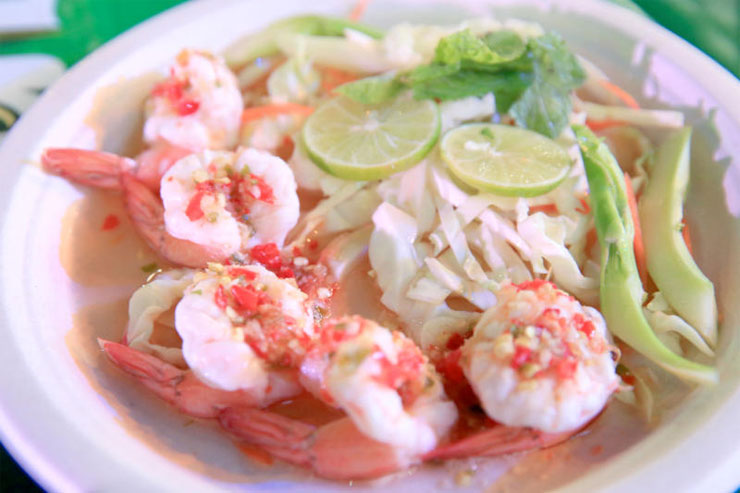 เริ่มต้นด้วย “กุ้งแซ่บเบียร์” เป็นเมนูที่เชฟอิ๊กเลือกกุ้งขาวขนาดใหญ่ ก่อนนำไปลวกให้สุกพอประมาณ เนื้อยังคงมีความหวานอยู่ ก่อนเสิร์ฟจะราดน้ำจิ้มซึ่งผสมด้วยเบียร์ ทั้งยังราดเบียร์สดบนตัวกุ้งอีกครั้งหนึ่งก่อนที่ลูกค้าจะได้รับประทาน ซึ่งนอกจากจะได้รสแล้วเบียร์ยังปรากฏกลิ่นในอาหารจานนี้ด้วย อาหารจานแซ่บนี้รับประทานแกล้มกับก้านคะน้ากรุบกรอบ จะช่วยเพิ่มรสชาติมากยิ่งขึ้น