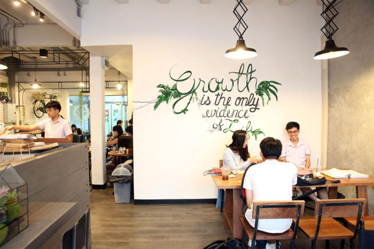 ร้านนี้มี 4 ชั้น รูปแบบของคาเฟ่และโค-เวิร์กกิ้ง สเปซ แห่งนี้มีเป้าหมายเพื่อตัดความวุ่นวายของบรรยากาศด้านนอก ขณะเดียวกันก็ให้แรงบันดาลใจคนมานั่ง การตกแต่งจึงเรียบง่ายด้วยโครงสร้างเหล็กแบบลอฟต์ จัดวางด้วยเฟอร์นิเจอร์ไม้จริง และแทรกความร่มรื่นด้วยต้นไม้ให้ความสดชื่น พื้นที่นี้จึงเป็นลอฟต์ที่อบอุ่น พื้นที่ใช้สอยจะเริ่มจากคาเฟ่ชั้น 2 ที่มีเคาน์เตอร์คาเฟ่และพื้นที่นั่งดื่มกาแฟ มีเครื่องดื่มและขนมโฮมเมดที่ถูกคัดสรรมาอย่างดี บรรยากาศไม่วุ่นวายเหมาะกับการทำงาน อ่านหนังสือ หรือจะนั่งพูดคุยก็ยังได้ ยิ่งไปกว่านั้นคือ Free Wi-Fi ทั้งวัน คุณสมบัติครบครัน บอกเลยว่าร้านนี้ต้องเก็บไว้ในลิสต์