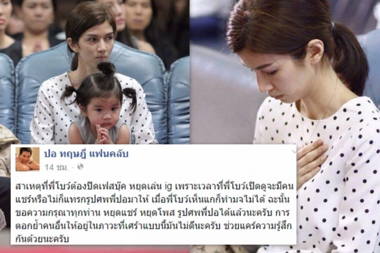 "สาเหตุที่พี่โบว์ต้องปิดเฟซบุ๊กหยุดเล่น ig เพราะเวลาที่พี่โบว์เปิดดูจะมีคนแชร์หรือไม่ก็แท็กรูปศพพี่ปอมาให้ เมื่อพี่โบว์เห็นแกก็ทำใจไม่ได้ ฉะนั้นขอความกรุณาทุกท่าน หยุดแชร์ หยุดโพสต์ รูปศพพี่ปอได้แล้วนะครับ การตอกย้ำคนอื่นให้อยู่ในภาวะที่เศร้าแบบนี้มันไม่ดีนะครับ ช่วยแคร์ความรู้สึกกันด้วยนะครับ"