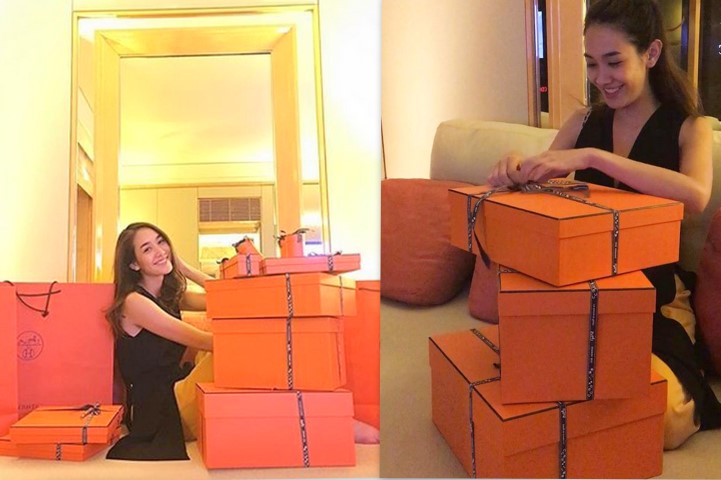 งานนี้เจ้าตัวไม่พลาดที่จะโพสต์ภาพผ่านอินสตาแกรม ขณะที่ตนนั่งอยู่ท่ามกลางกล่องแบรนด์เนมดังกองโตอวดแฟนๆให้กดไลค์อิจฉาตาร้อนกันเป็นแถวๆ