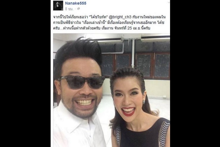 "โค้ชไบรท์ @bright_ch3 กับงานใหม่ของผมในการเป็นพิธีข่าวใน "เรื่องเล่าเช้านี้" มีเรื่องต้องเรียนรู้จากเธออีกมาก โค้ชครับ ฝากเนื้อฝากตัวด้วยครับ เริ่มงาน จันทร์ที่ 25 เมษายนนี้ครับ"