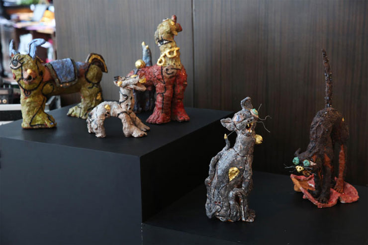 “แต่ก่อนผมทำเป็นรูปพวกสัตว์ประหลาด แต่เดี๋ยวนี้เป็นหมา ผมเอาคาแรกเตอร์สองตัวนี้มาเชื่อมกัน ผมทำเป็นตาโตเพราะผมจะสื่อถึงความตกใจ ส่วนใหญ่งานจะเป็นเรื่องของการตั้งคำถาม ส่วนงานสีขาวเป็นเรื่องของความทุกข์ จมกับความทุกข์ ผมใช้งานศิลปะกับตัวผมเป็นงานเชื่อมต่อกัน โดยใช้โลกแห่งจินตนาการในตัวผมเป็นตัวเชื่อม คอนเซ็ปต์ของผลงานสองชิ้นนี้มันค่อนข้างต่างกันแต่มันก็จะมีตัวเชื่อมกันตลอด การเปิดตัวงานของผมมันก็แค่สุนัขตัวหนึ่งกับคนรักของผม แต่คนจะมองเป็นแบบไหนก็แล้วแต่มันมองได้หลายแบบ ที่ใช้สีน้อยเพราะมันเป็นเรื่องของความทุกข์ความเหงาที่เราอยากจะสื่อออกมา เราไม่ได้ใช้อารมณ์ความรู้สึกอย่างเดียวในการทำงานศิลปะ สีที่มีโครงสร้างเหล่านี้มันอาจบอกอารมณ์ความรู้สึกได้ตรงตัว แต่ในปัจจุบันงานผมมีสีสันเพิ่มมากขึ้น ผมไม่ได้ตีค่าโลกของผมด้วยสีขาวเทาและดำแล้ว”