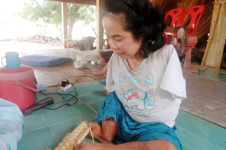 สาวพิการไร้แขนสู้ชีวิตใช้เท้าถักไหมพรมขายเลี้ยงดูพ่อชรา