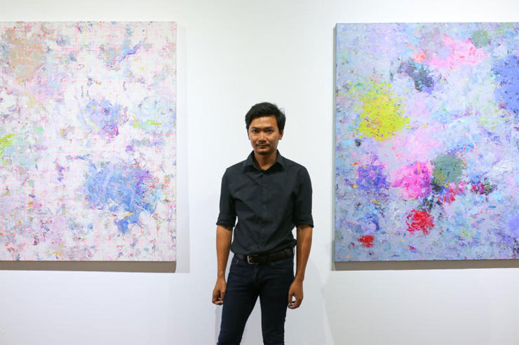 “คอนเซ็ปต์ในการทำงานชุดนี้ มีพื้นที่สีขาวคือเฟรมแล้วตัววัสดุคือปัญหา ผมพยายามใส่ปัญหาเข้าไปในพื้นที่สีขาว แล้วพยายามใช้จิตใจในการบำบัดให้สีอะครีลิคมันทับไปทับมาให้รู้สึกถึงกระบวนการว่ามันขึ้นมาเรื่อยๆ งานของผมไม่ได้มีที่มาจากรูปทรงใดๆ แต่คนจะมองว่าใบไม้ ต้นหญ้าก็แล้วแต่เขาจินตนาการได้ แต่ในการทำงานของผมแค่ใส่สีลงในพื้นที่สีขาว แล้วคลี่คลายปัญหาให้ออกมาโดยใช้การควบคุมสี น้ำหนัก ไม่สนใจเลยว่า คนอื่นจะมองว่าสวยไหม อยู่ที่จิตใจของผมว่ามันพอแล้วหรือยัง บางชิ้นลงสีไปสองเลเยอร์ก็พอ บางชิ้นทับเป็นสิบเลย บริหารจิตใจจนพื้นที่สีขาวถูกกลบไปหมด จนปัญหาที่คลี่คลายในเฟรมออกมาเป็นความงาม แต่คราวนี้มีการนำซีเมนต์เข้ามาในเนื้องาน เป็นการทดลองวัสดุ ไม่ได้มีความหมายใดๆ ผมเพียงต้องการสร้างเอลิเมนต์ความงามในงาน ศิลปินให้ความสำคัญที่วิชวลของงานแต่งานมีความลึกซึ้งขนาดไหนให้คนมาเสพได้ตีความเอง งานจะมีความหมายขึ้นเมื่อคนดูตีความไปต่างๆ”