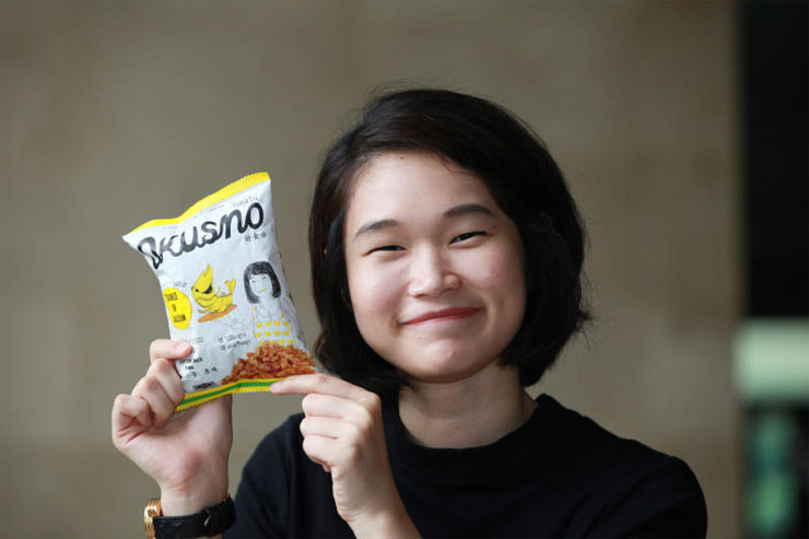 "ขนมคางกุ้งทอด หรือโอคุสโน่ ในภาษาสโลวีเนีย แปลว่า อร่อย ที่ใช้ภาษานี้เพราะว่าหลังจากแพรเรียนจบจากคณะวารสารศาสตร์ ภาคภาษาอังกฤษ มหาวิทยาลัยธรรมศาสตร์ แพรมีโอกาสได้ทุนไปทำงานด้านกราฟฟิกดีไซน์ที่ประเทศสโลวีเนียอยู่ประมาณ 4 เดือน ที่นั่นทำให้เราตกผลึกกับตัวเอง ว่าอยากจะกลับมาสร้างธุรกิจ หลังกลับมาเมืองไทยไม่นานก็เริ่มต้นธุรกิจไอศกรีมสับปะรดก่อน เป็นแบบซื้อมาขายไป แต่ขนมคางกุ้งนี่เกิดจากเรื่องบังเอิญบนโต๊ะอาหารแท้ๆ เลยค่ะ เราเห็นว่าคุณแม่แกะหัวกุ้งทิ้ง เราก็เลยสงสัยว่าส่วนนี้ของกุ้งสามารถกินได้ไหม พวกเรา 3 คนพี่น้องก็ช่วยกันคิดโปรดักต์ขึ้นมาจากส่วนที่เราเรียกมันว่าคางกุ้งนี่แหละค่ะ"