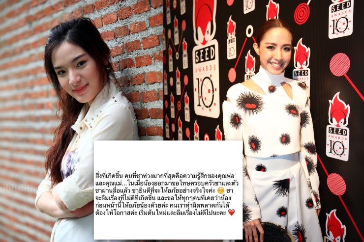 "เหตุการณ์ครั้งนี้ที่เกิดขึ้นหนูยังไม่ได้คุยกับพ่อเยอะ เพราะตอนที่ไปเที่ยวทะเลมันไม่ค่อยมีสัญญาณ พ่อก็แค่ทักมาถามว่า มันจริงหรือเปล่า พ่อสอนแกมาดีมาก ให้ทุกอย่าง แกมีทุกอย่างทำไมถึงชอบทำลายชีวิตตัวเอง เอาจริงๆ พ่อเขาก็ผิดหวัง แต่เดี๋ยวกลับไปได้เจอกันก็คงคุยกัน หนูก็ยอมรับว่าสิ่งที่พ่อพูดมามันทำให้ได้ฉุกคิด เพราะหนูเองก็เป็นคนใจร้อน ควบคุมตัวเองไม่ค่อยได้ บทเรียนที่ได้ครั้งนี้ก็เยอะมาก หนูเป็นคนของสังคมทำอะไรก็ต้องระวังทุกอย่างเลย หลังจากนี้อาจจะพักการเล่นโซเชียลไปซักระยะหนึ่ง"ดาราสาวกล่าว