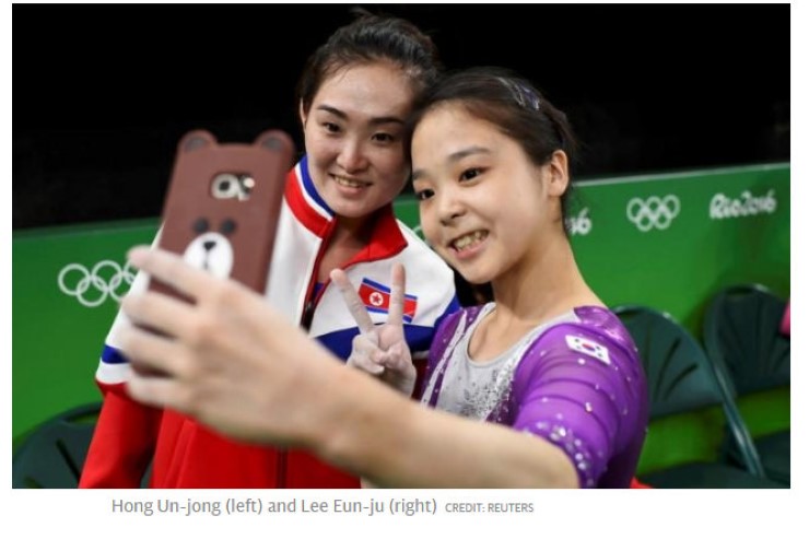 อีอึนจู วัย 17 ปี จากเกาหลีใต้ และฮองอึนจอง วัย 27 ปี ของเกาหลีเหนือ ถ่ายเซลฟี่ด้วยกันอย่างยิ้มแย้มระหว่างที่ทั้งสองกำลังวอร์มร่างกายเพื่อเตรียมแข่งขันยิมนาสติกรอบคัดเลือก นอกจากนี้ ยังมีภาพที่สองนักยิมนาสติกพูดคุยและหัวเราะกันอย่างสนิทสนม ต่างจากนักกีฬาจากประเทศเลบานอนที่ปฏิเสธไม่นั่งรถบัสคันเดียวกับนักกีฬาของอิสราเอล อ้างว่าเพื่อหลีกเลี่ยงการกระทบกระทั่ง