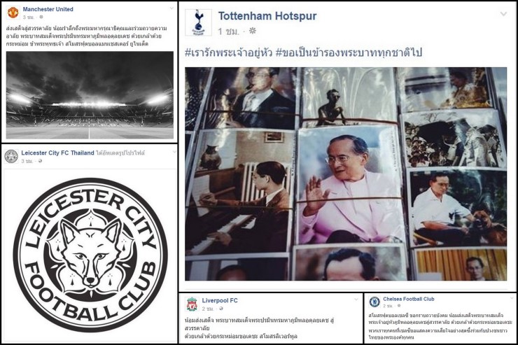 ด้านสโมสรสเปอร์ส ระบุว่า พระบาทสมเด็จพระเจ้าอยู่หัว รัชกาลที่ 9 พร้อมข้อความ "เรารักพระเจ้าอยู่หัว #ขอเป็นข้ารองพระบาททุกชาติไป" ส่วนสโมสรเลสเตอร์ ซิตี้ ได้เปลี่ยนรูปโปรไฟล์เป็นภาพขาวดำ เพื่อไว้อาลัยถวายแด่พระบาทสมเด็จพระเจ้าอยู่หัวรัชกาลที่ 9
