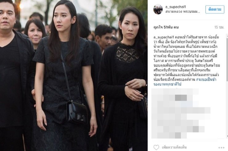 "ตอนเช้า ได้รับสายจาก น้องอั้ม ว่า พี่เอ อั้มร้องไห้ทุกวัน เห็นรูป เห็นข่าวก็น้ำตาไหลไม่หยุดเลย พี่เอไปสนามหลวงอีกวันไหน อั้มขอไปถวายความเคารพพระองค์ท่านด้วย พี่เอบอกว่าวันนี้ก็ไป แล้วเราก็มีโอกาสมากราบที่หน้าประตูวิเศษไชยศรี ขอบคุณพี่น้องที่นั่งอยู่ตรงข้ามประตูวิเศษไชยศรีนะครับ ที่กรุณาเสียสละที่เล็ก ๆ ตรงริมฟุตบาทให้พี่เอและน้องอั้มได้ก้มลงกราบแล้วน้อมจิตระลึกถึงพระองค์ ท่าน"