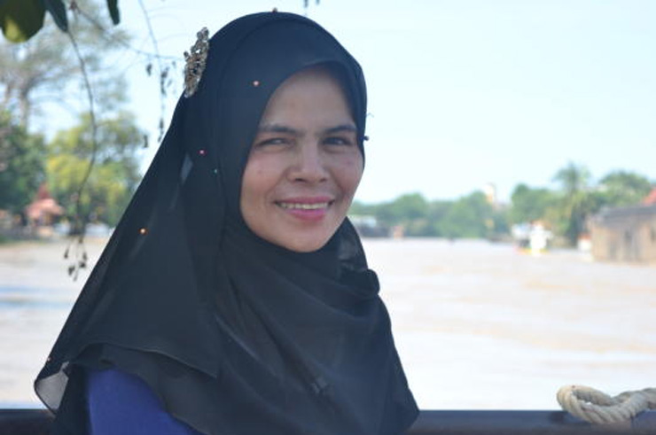 ฟาติม๊ะห์ เข็มมณี มองไปยังริมแม่น้ำเจ้าพระยา ซึ่งกำลังขึ้นสูงและไหลเชี่ยวกรากจากอิทธิพลมรสุมพายุที่พัดผ่านอย่างต่อเนื่องในช่วงเดือน ก.ย.ที่ผ่านมา สายน้ำเส้นเดียวกับที่เคยพรากชีวิตคนที่เธอรู้จักไปมากมาย จากเหตุการณ์เรือล่มหน้าวัดสนามไชย จ.พระนครศรีอยุธยา เมื่อวันที่ 18 ก.ย.ที่ผ่านมา