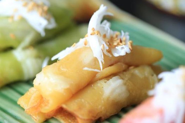 7.นำกระทะเคลือบสารกันติดตั้งไฟอ่อน รอให้กระทะร้อนแล้วจึงใช้ช้อนตักส่วนผสมหยอดลงบนกระทะ เกลี่ยบางๆ ให้แผ่นแป้งกว้างประมาณ 5-6 ซม. รอให้แป้งสุก สังเกตจากหน้าที่แห้งขึ้นไม่เยิ้มติดมือ จึงกลับด้านเพื่อจี่อีกด้านให้สุกเสมอกัน ค่อยๆ ม้วนแป้งขึ้นมาจากริมด้านหนึ่งถึงอีกด้าน ตักขึ้นจากกระทะ พักไว้บนใบตองหรือจาน รอให้คลายความร้อนสักนิด ก่อนรับประทานตอนอุ่นๆ จะอร่อยที่สุด