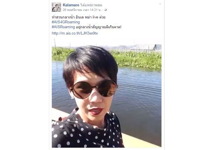 เช่นกันกับคุณ "กาละแมร์" ที่มักจะเดินทางท่องเที่ยวอยู่บ่อยครั้ง ในแต่ละครั้งเธอมักจะถ่ายทอดเรื่องราวการเดินทาง LIVE ผ่านเฟซบุ๊กอยู่เสมอ และครั้งนี้เธอได้เลือกใช้บริการ AIS 4G Roaming เพื่อแบ่งปันประสบการณ์การเดินทางในประเทศพม่า ผ่าน www.facebook.com/KalamareFanpage โดยเจ้าตัวได้พูดถึงบริการโรมมิ่งของ AIS 4G ว่า เหมาะสำหรับผู้เดินทางต่างประเทศที่ต้องการใช้อินเทอร์เน็ตอย่างยิ่ง เพราะมีความสะดวกคุ้มค่า เปิดใช้งานได้ง่ายด้วยตนเอง ผ่าน Application สามารถตั้งเวลาสมัครแพ็กเกจก่อนเดินทางได้ ในเรื่องของสัญญาณก็หายห่วง เพราะขณะที่ LIVE ผ่านเฟซบุ๊กนั้น คุณกาละแมร์ได้ท่องเที่ยวทางเรืออยู่กลางทะเลสาบอินเล สัญญาณยังดีเยี่ยม สามารถพูดคุยสดๆ ผ่านแฟนเพจได้แบบไม่สะดุด