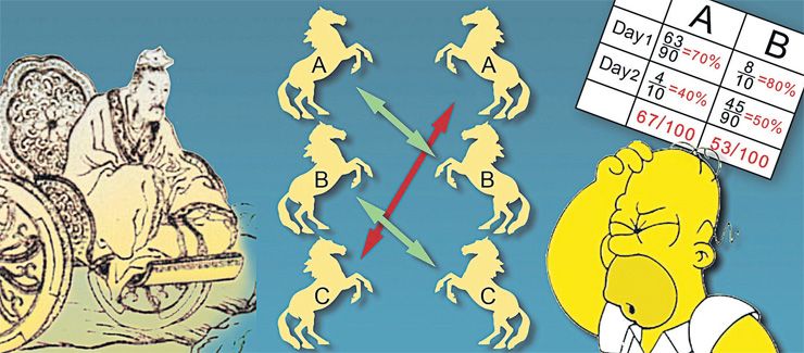 เมื่อนับจากตัวเลขเปอร์เซ็นต์การรักษาของทั้งสองครั้งจึงสรุปได้ว่า หมอ B รักษาคนไข้ได้เปอร์เซ็นต์มากกว่าหมอ A ทั้งสองครั้ง (คือ 80% และ 50%) จึงสรุปว่าหมอ B มีประสิทธิภาพการรักษาที่ดีกว่า...แต่ผิด!