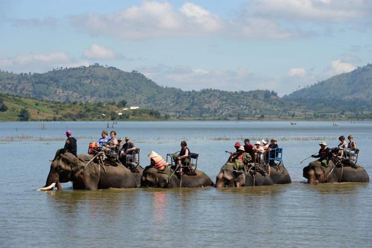 กลุ่มนักท่องเที่ยวชาวต่างประเทศกำลังนั่งบนกูบช้างเดินข้ามทะเลสาบลัก บนพื้นที่ราบสูงอยู่ตอนกลางของประเทศเวียดนาม และอยู่ในเขตจังหวัดดั๊กลัก ซึ่งเป็นที่อยู่อาศัยของกลุ่มชนพื้นเมืองจำนวนมากที่ไม่ใช่กลุ่มชาติพันธุ์เวียดนาม (เหวียต)