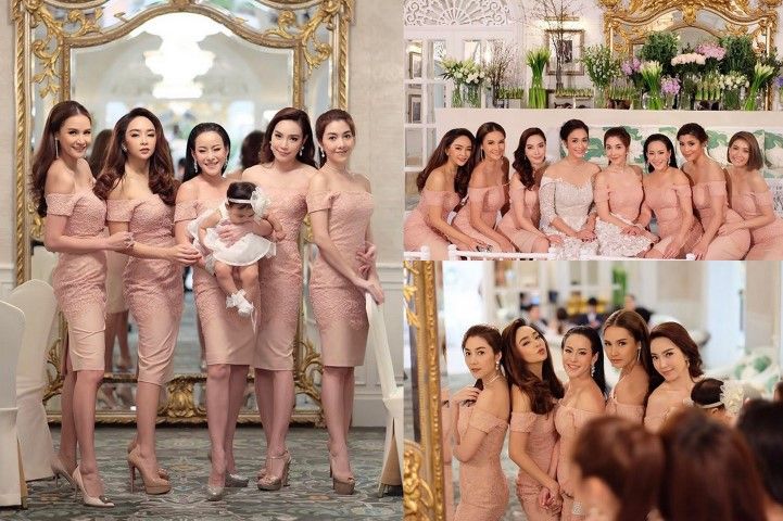 นอกจากเจ้าสาวที่ต้องสวยปังที่สุดในงานแล้ว บรรดาแก๊งเพื่อนเจ้าสาวก็ไม่น้อยหน้าแต่งตัวทำผมกันมาแบบจัดเต็มไม่มีใครยอมใคร มาในชุดเดรสสั้นสีชมพูหวานปาดไหล่ โชว์ผิวขาวเนียนกันครบแก๊ง อาทิ เอมี่ กลิ่นประทุม, เอมมี่ มรกต, วุ้นเส้น วิริฒิพา , เมย์ พิชญ์นาฏ , เป้ย ปานวาด, หนิง ปณิตา, กระแต ศุภักษร