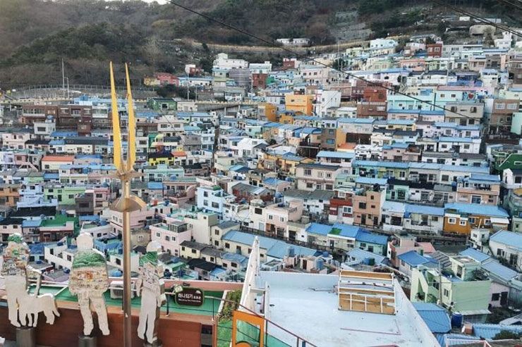 การท่องเที่ยวในเมืองปูซาน เราเริ่มต้นที่ หมู่บ้านวัฒนธรรมคัมชอน แลนด์มาร์คสำคัญของเมืองที่หลายคนรู้จักกันในนาม ซานโตรินีเกาหลี จากบ้านที่ถูกทิ้งร้างสภาพทรุดโทรมได้ถูกตกแต่งเนรมิตด้วยสีสันพาสเทลตามบ้านเรือนที่เรียงตัวกันบนเนินเขาริมแนวชายฝั่งทะเล กลายเป็นแหล่งท่องเที่ยวขึ้นชื่อดึงดูดผู้คนให้มาเช็กอิน โดยตลอดสองข้างทางจะพบศิลปะตามกำแพงฝีมือศิลปินนักเรียนและจิตรกรจากทั่วโลก ตัวตึกประดับตกแต่งด้วยรูปปั้นแบบต่างๆ อย่างรูปปั้นนกบนหลังคา และเมื่อเดินไปเรื่อยๆ จะมีจุดชมวิว แหล่งช็อปปิ้ง และคาเฟ่น่ารักตามซอยให้แวะชิมชิลถ่ายภาพเก็บความประทับใจอยู่ตลอด