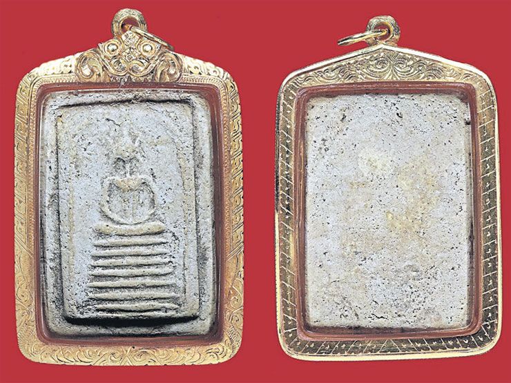 องค์แรก ชมสมเด็จบางขุนพรหมพิมพ์สังฆาฏิ แขนกลมฐานขาสิงห์ ซึ่งจัดสร้างโดยเสมียนตราด้วง ต้นตระกูลธนโกเศศ ท่านศรัทธาในสมเด็จโตมากและเป็นผู้สร้างพระหลวงพ่อโต ซึ่งปัจจุบันอยู่ที่วัดอินทรวิหาร จุดสำคัญของพิมพ์นี้คือ แขนกลม ฐานชั้นกลางจะเป็นขาสิงห์และฐานชั้นล่างสุดเต็มตันตลอดและปลายฐานทางด้านซ้ายจะสอบเข้า สวยดูง่ายแบบองค์นี้ ราคาเช่าหาอยู่ที่หลักล้าน