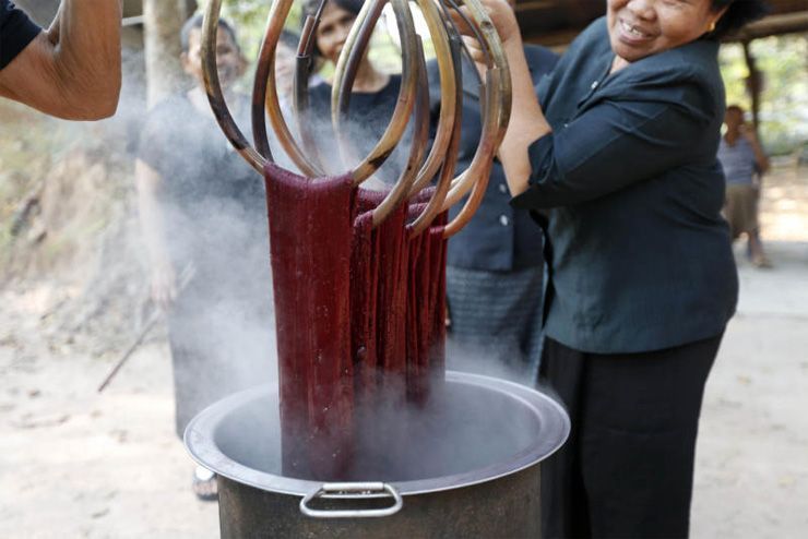 ไหมยกทองโบราณจันทร์โสมา ใช้วิธีย้อมแบบโบราณด้วยวัตถุดิบจากสีธรรมชาติ ทั้งสีแดงจากครั่ง สีน้ำเงินจากคราม สีเหลืองทองจากเปลือกทับทิม นอกจากจะสวยงามและปลอดภัย สีสันของมันจะยังสดใสไปเป็นร้อยปี