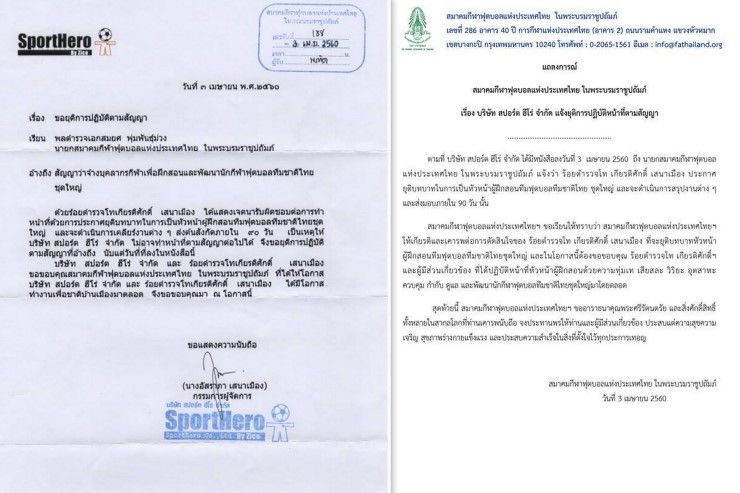 บริษัท สปอร์ต ฮีโร่ฯ ยื่นหนังสือต่อสมาคมฟุตบอล ขอยกเลิกสัญญาการจ้างบุคลากรแล้ว