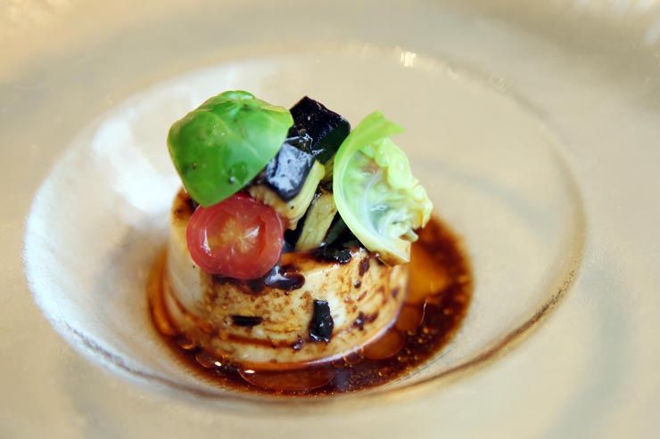 เริ่มต้นเมนูแรกด้วยจานเรียกน้ำย่อยที่ให้พลังงานสูง กินง่ายและย่อยง่าย เหมาะกับสายสุขภาพ โกมะพุดดิ้ง หรือพุดดิ้งเต้าหู้งา เป็นโฮมเมดสูตรพิเศษ ที่ไม่มีกลิ่นคาวของเต้าหู้ แต่ได้กลิ่นหอมจากงาดำ เสิร์ฟคู่กับผักดองแบบญี่ปุ่น ราดด้วยซอสที่ให้รสเผ็ดนิดๆ เมื่อตักกินพร้อมกัน หนึ่งคำจะมีทั้งความนุ่มเนียนของพุดดิ้ง และความชุ่มฉ่ำหวานๆ เปรี้ยวๆ ของผักดอง เป็นเมนูให้คุณค่าและเรียกความสดชื่น แถมอยากอาหารได้ดีเมนูหนึ่ง