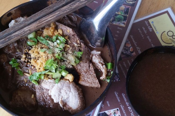 ที่ร้านนี้จะมีก๋วยเตี๋ยวเรือหมูทั้งน้ำ ทั้งบก หรือ ว่าแห้ง และก็นานาลวกจิ้ม ด้านเส้นก็มีทุกแบบ แถมยังเพิ่มเติมบะหมี่หยกมาให้เลือกอีกต่างหาก และทุกจานจะมีให้เลือกทั้งหมูหมัก หมูตุ๋น ตับ ลูกชิ้น และที่พิเศษคือตีนไก่ที่เปื่อยยุ่ยกำลังดีใครจะสั่งทุกอย่างก็ได้ไม่ว่ากัน ที่แอบชอบใจคือทุกชามจะเสิร์ฟมาในจานกะลามะพร้าวสวยงามล่อตาล่อใจสุดๆ