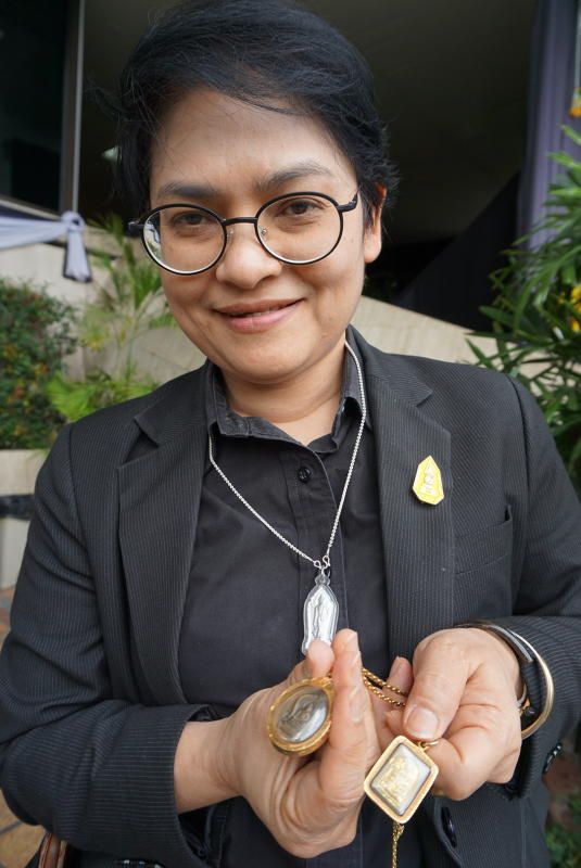 ก่อนจะออกจากบ้านเธอจะไม่ลืมคล้องพระเพื่อความอุ่นใจ โดยเลือกสลับไปมาไม่ได้ซ้ำเหมือนเดิมทุกวัน แต่ที่สวมคอบ่อยๆ ที่สุด คือ เหรียญไพรีพินาศ ปี 2534 รุ่น 50 ปี กรมอาชีวศึกษา วัดบวรนิเวศวิหาร ซึ่งจะมีส่วนผสมแผ่นยันต์พระเกจิอาจารย์ทั่วประเทศ, พระสมเด็จชนะ วัดชนะสงคราม ด้านหลังเป็นสมเด็จกรมพระราชวังบวรมหาสุรสิงหนาท