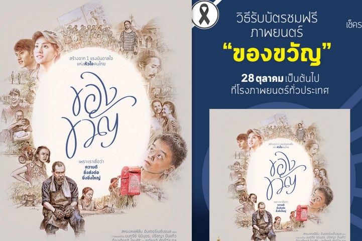 “สหมงคลฟิล์ม อินเตอร์เนชั่นแนล” และ “โรงภาพยนตร์ทั่วประเทศไทย” พร้อมจัดฉายภาพยนตร์แห่งแรงบันดาลใจเรื่อง “ของขวัญ” 4 ภาพยนตร์สั้นอันได้รับแรงบันดาลใจจาก “พระบาทสมเด็จพระเจ้าอยู่หัว รัชกาลที่ 9” เพื่อส่งต่อและหล่อเลี้ยงพลังใจให้คนไทยทั้งประเทศ ชมฟรี ตั้งแต่วันที่ 28 ตุลาคมนี้ เป็นต้นไป โดยมี “เงื่อนไขการรับบัตรชมภาพยนตร์” ที่โรงภาพยนตร์เครือต่างๆ ดังนี้
