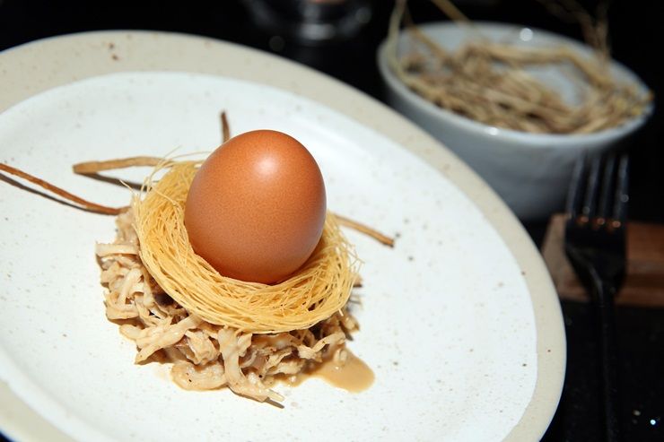 ต่อด้วย Nest เมนูซิกเนเจอร์ของร้าน ที่นำเสนอในรูปแบบของรังนก โดยนำไข่ไก่ออนเซนโดยทำให้สุกที่ความร้อนเหมาะสม จัดวางบนฟางที่ทำจากเส้นหมี่กรอบของข้าว ด้านล่างเป็นไก่ฉีกคลุกซอสไก่ โรยด้วยผงเห็ดพอร์ชินี เห็ดชิตาเกะ และน้ำมันทรัฟเฟิล เป็นอีกหนึ่งเมนูที่น่าลิ้มลอง