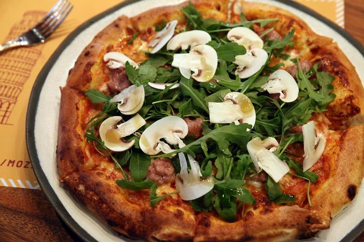ใครเป็นแฟนเห็ดขอให้ลอง Groviglio Pizza (Mozzarella, mushroom carpaccio, sausage & rocket salad) ที่มีชีสมอซซาเรลลา คาร์ปาโชเห็ดสดๆ บางเฉียบ ไส้กรอกอิตาเลียน และผักร็อกเกตสลัดแต่งหน้า (660 บาท)