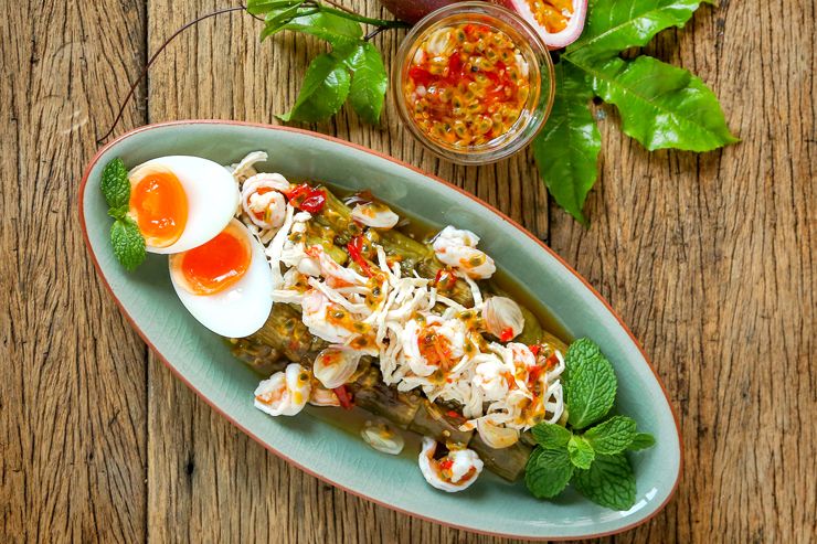 ผสมน้ำยำโดยเคี่ยวน้ำตาลปี๊บกับน้ำสะอาดสัก 1 ช้อน โต๊ะให้เดือดเบาๆยกลงจากเตา เติมน้ำปลาลงไปตอนที่ยังร้อนๆ ตามด้วยผ่าครึ่งเสาวรสและตักส่วนน้ำและเมล็ดใส่ลงในน้ำตาล เติมมะนาวเล็กน้อย (ปรับรสตามชอบให้ออกเปรี้ยว เค็ม หวาน ) ใส่พริกแดงที่โขลกไว้กับกระเทียม พร้อมหอมแดงซอย