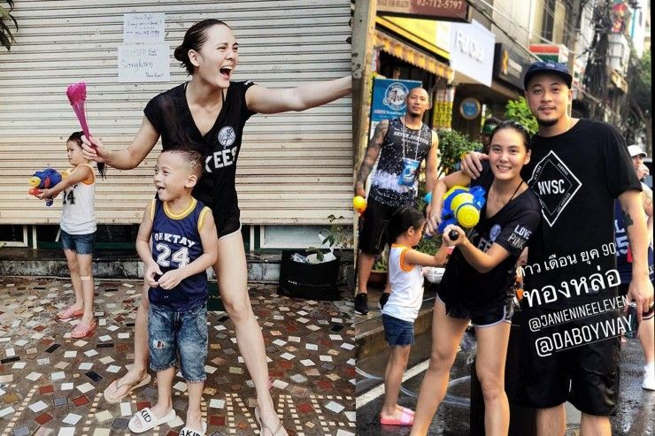 เจนี่ เทียนโพธิ์สุวรรณ ในลุคสบายๆ หน้าสดหนีบแตะเล่นน้ำสงกรานต์กับหลานรัก บีน่า-บรู๊คลิน บนถนนทองหล่อ